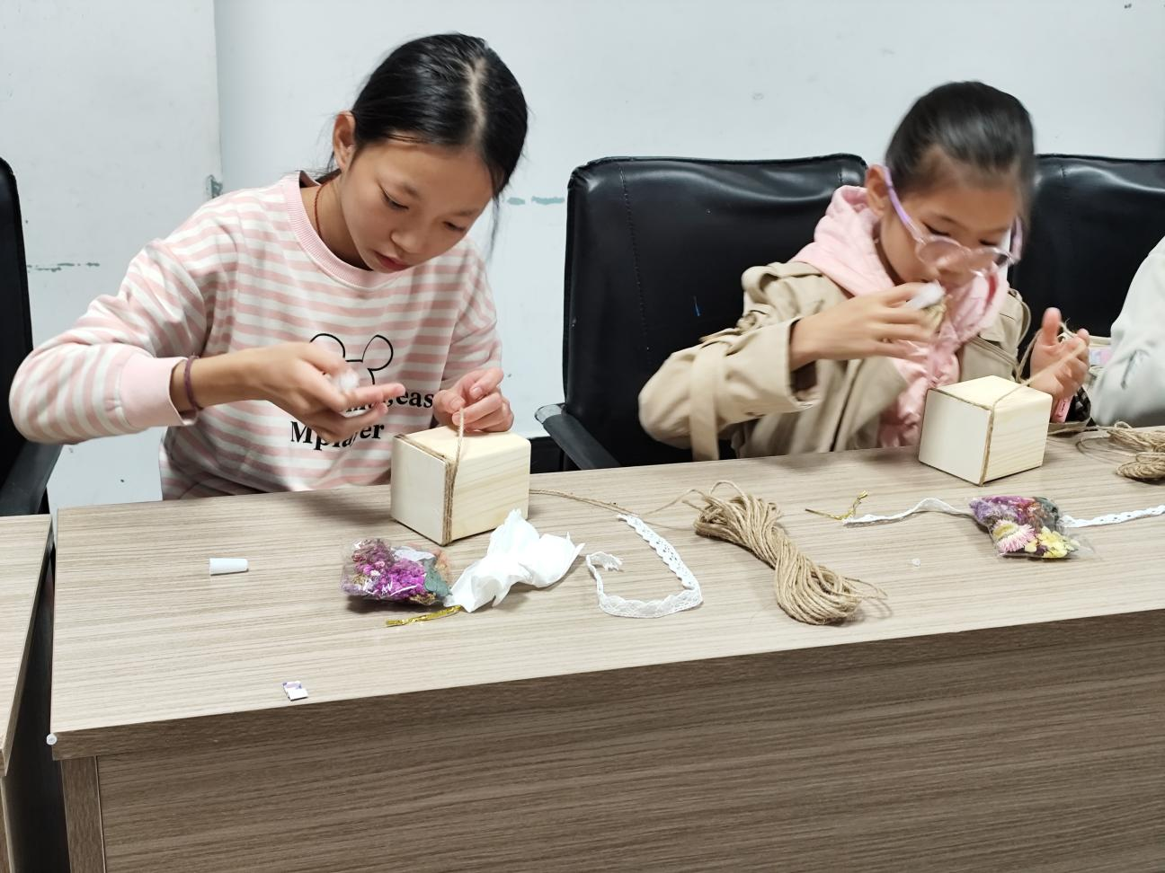 活动现场,长桌上摆满彩纸、麻绳、干花等材料,邓老师详细讲解笔筒制作步骤,社区干部则巡回协助。孩子们专注投入,将废弃塑料瓶、木块变废为宝——有男孩高举粉色花朵笔筒展露自豪,有女孩用麻绳缠绕笔筒获老师称赞,胶水瓶、彩珠与手机参考图散落桌面,与忙碌身影构成鲜活创作图景,背景墙“文明实践站”“教书育人”红色标牌更添温馨氛围。
