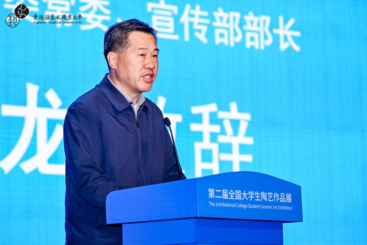 张龙在致辞中指出,景德镇以数字化服务赋能展览举办,通过专属小程序、AIGC互动展陈与“云参观”等形式,推动陶瓷艺术突破时空界限。他表示,“天工开物·智韵瓷章”的主题诠释了传统智慧与当代创新的交融,期待青年学子以文化自信为基、创新创造为翼,勇立陶瓷艺术潮头,成为中华优秀传统文化的传承者与中外文明互鉴的推动者。
