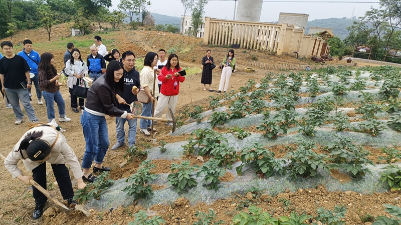 在校园劳动实践基地,老师们手持锄头、钉耙等挖地农具,俯身挖起一颗颗饱满的土豆,感受农耕劳作的艰辛与收获的喜悦。劳作间隙,参观人员品尝孩子们煮的热气腾腾的“敬乐茶”,茶香氤氲中,老师们交流着劳动心得,在劳逸结合中体悟劳动教育的深层内涵。
