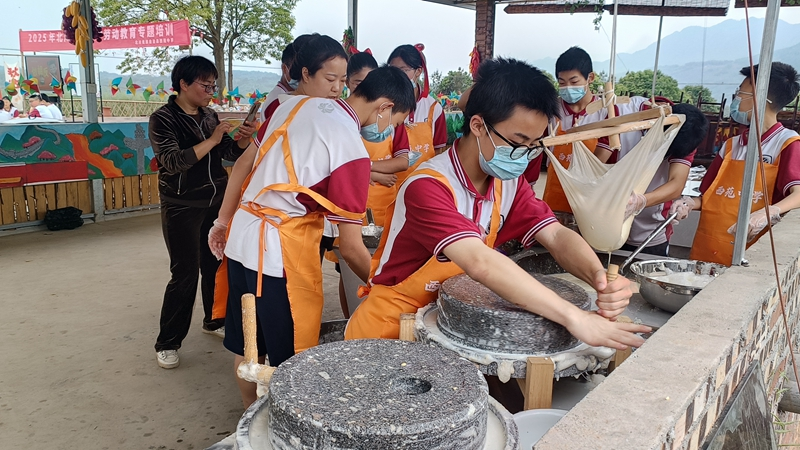 西苑中学青年教师朱慧敏呈现了一堂生动的劳动教育展示课。在体验环节,同学们围坐在圆桌,进行手工制作比赛。在“传统工艺制作”环节中,学生们在劳动教育老师赵春兰的指导下分工协作,从泡豆、磨浆到点卤、成型,一步步完成豆腐豆花的制作。当细腻的豆花在容器中成型时,孩子们脸上洋溢着的幸福的笑容。