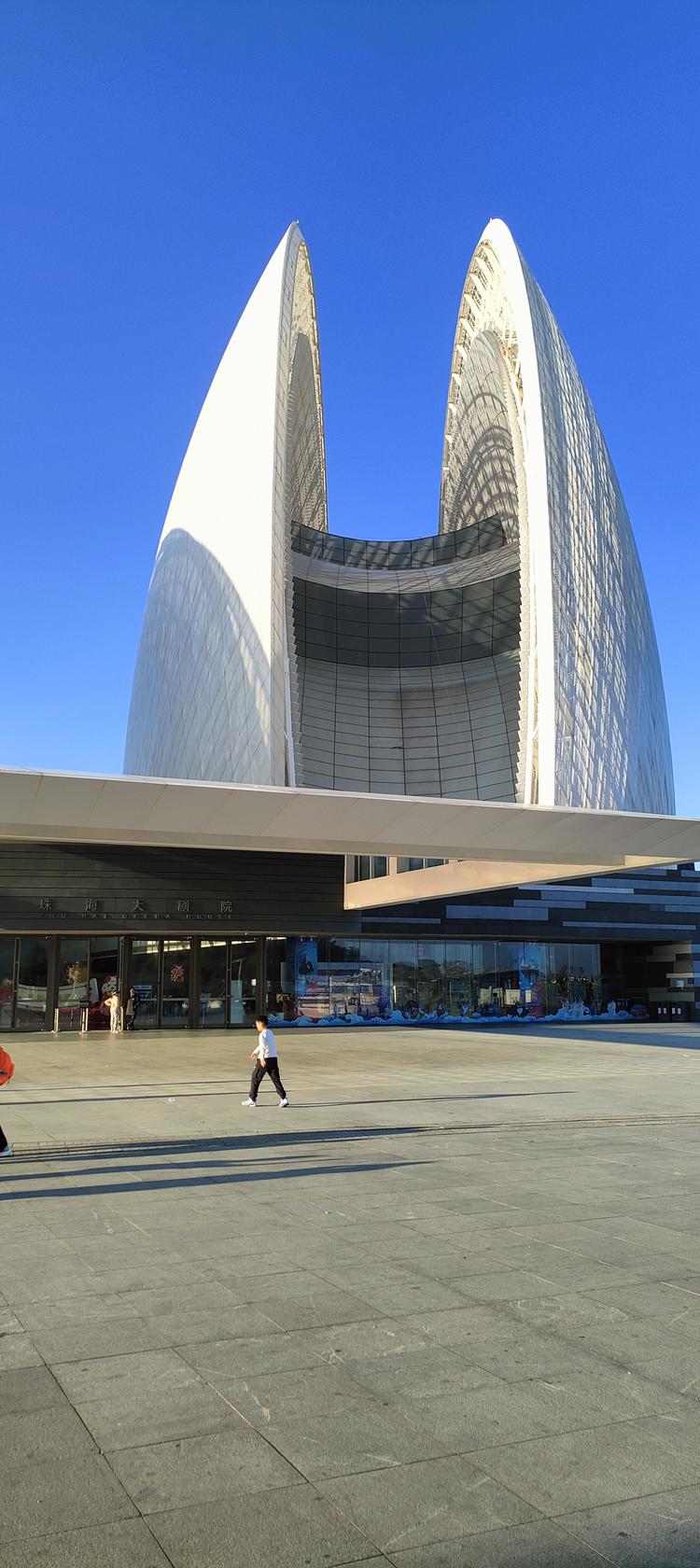 带着这份沉重的心绪,我们到了珠海。心情却很快被那明媚的海湾点亮了。午后,我们来到野狸岛畔,远远便望见了那巨大的“日月贝”——珠海大剧院。两个洁白的贝壳形体,依偎在蔚蓝的海边,在午后偏西的阳光斜照下,仿佛自身会发光一般,柔和而圣洁。阳光给它们镶上了一道浅浅的金边,海面吹来的风,似乎也带着贝类特有的、清新的腥气。天空中有几缕纤云,被落日染上了淡淡的霞彩,粉紫金红,若有若无,更衬得那“贝壳”晶莹剔透。快艇在附近的海面划过白色的弧线,更有直升机“哒哒”地掠过天空,为这幅静美的画面添上动态的注脚。一切显得如此现代、闲适而美好。